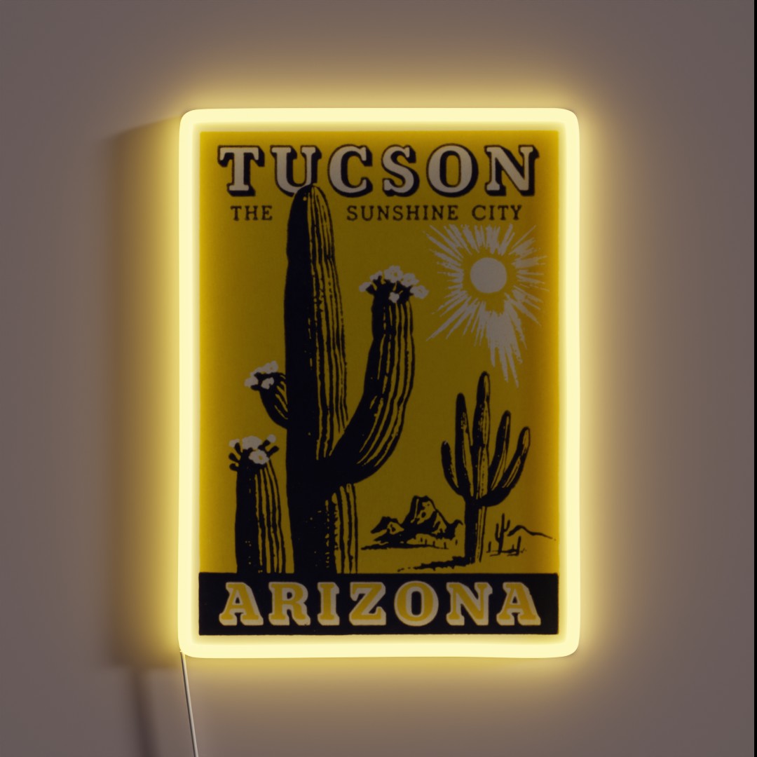 Vintage-style 1940s-inspired RGB neon sign featuring iconic Tucson, Arizona design, perfect for adding retro charm to any room or office.
