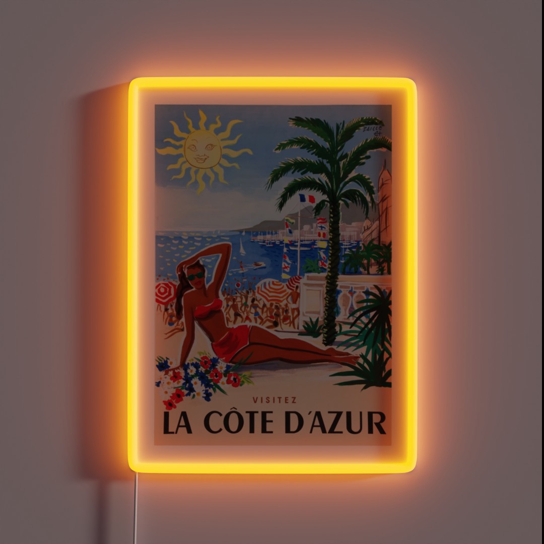 Step back in time with the vibrant glow of this retro-style travel poster neon sign, evoking the charm of 1950s France’s picturesque Cรดte d’Azur coastline. This unique piece of decor combines art and nostalgia, transporting you to a bygone era.