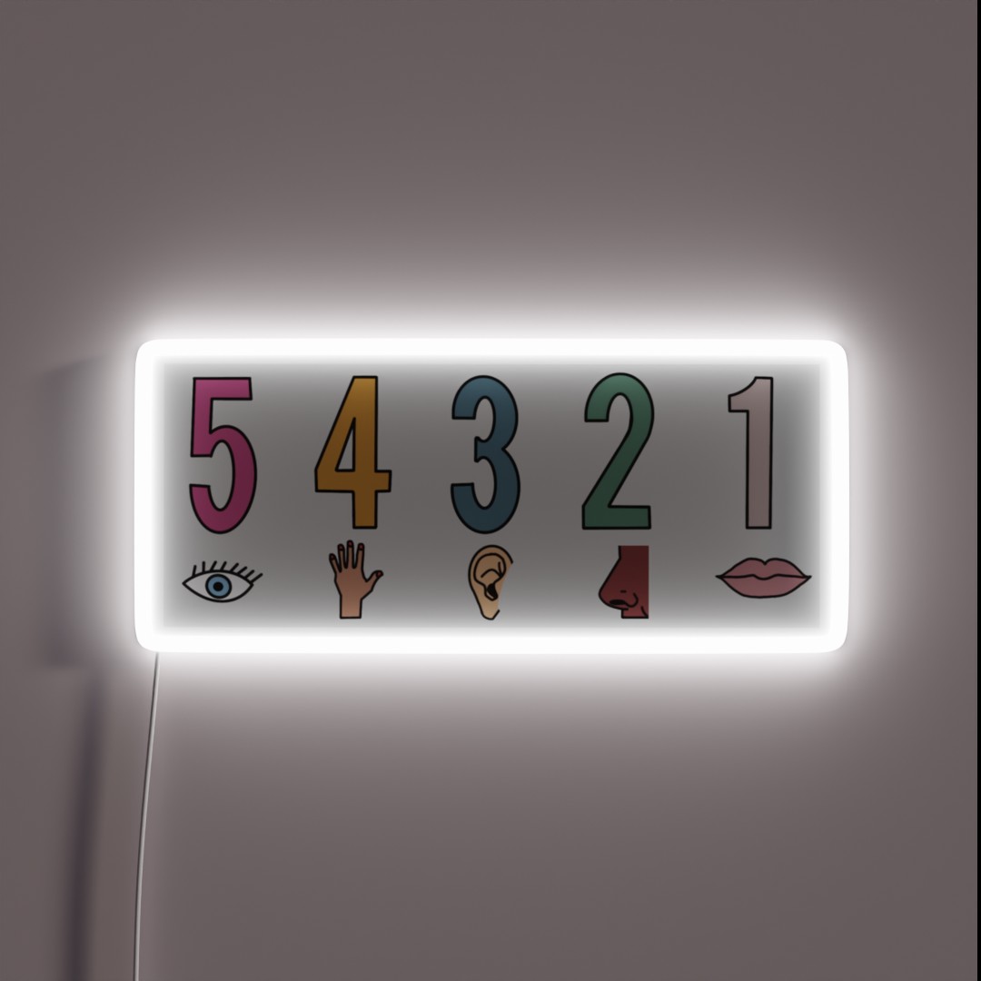 A vibrant, high-quality RGB neon sign featuring the numerals ‘54321’ in a bold, modern design. Perfect for those who prioritize grounding techniques and self-care, this unique decorative piece adds a touch of ambiance and energy to any room.