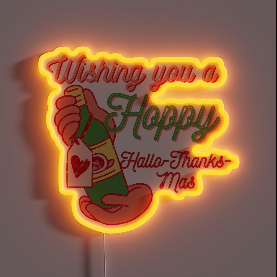 Add a festive touch to your home or bar with this unique ‘A Hoppy Hallo Thanks Mas’ RGB neon sign, featuring colorful LED lights that spell out a hoppy holiday message.