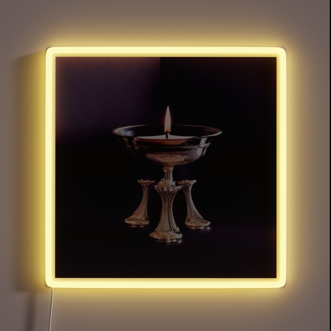 A Lit Candle In A Silver Bowl On A Table RGB Neon Sign
