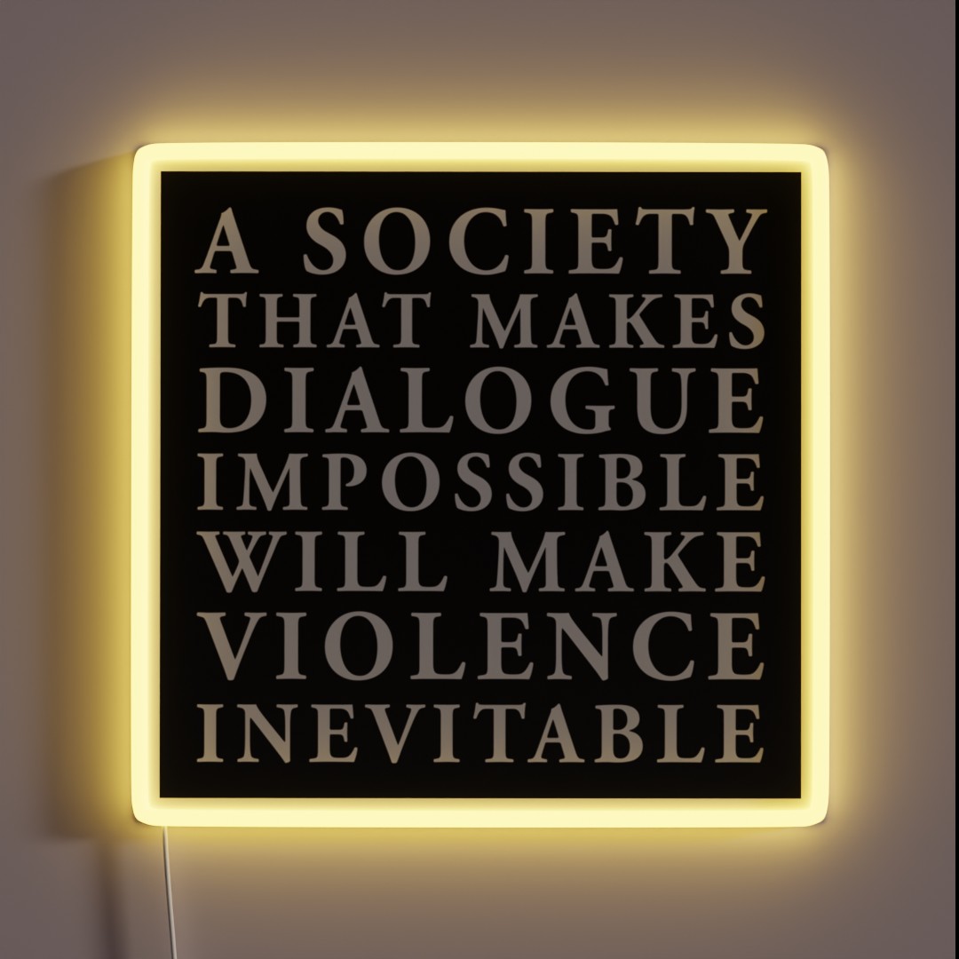 Illuminate your space with a thought-provoking reminder of the consequences of suppressing conversation: ‘A society that makes dialogue impossible will make violence inevitable’ – a striking RGB neon sign for any room.