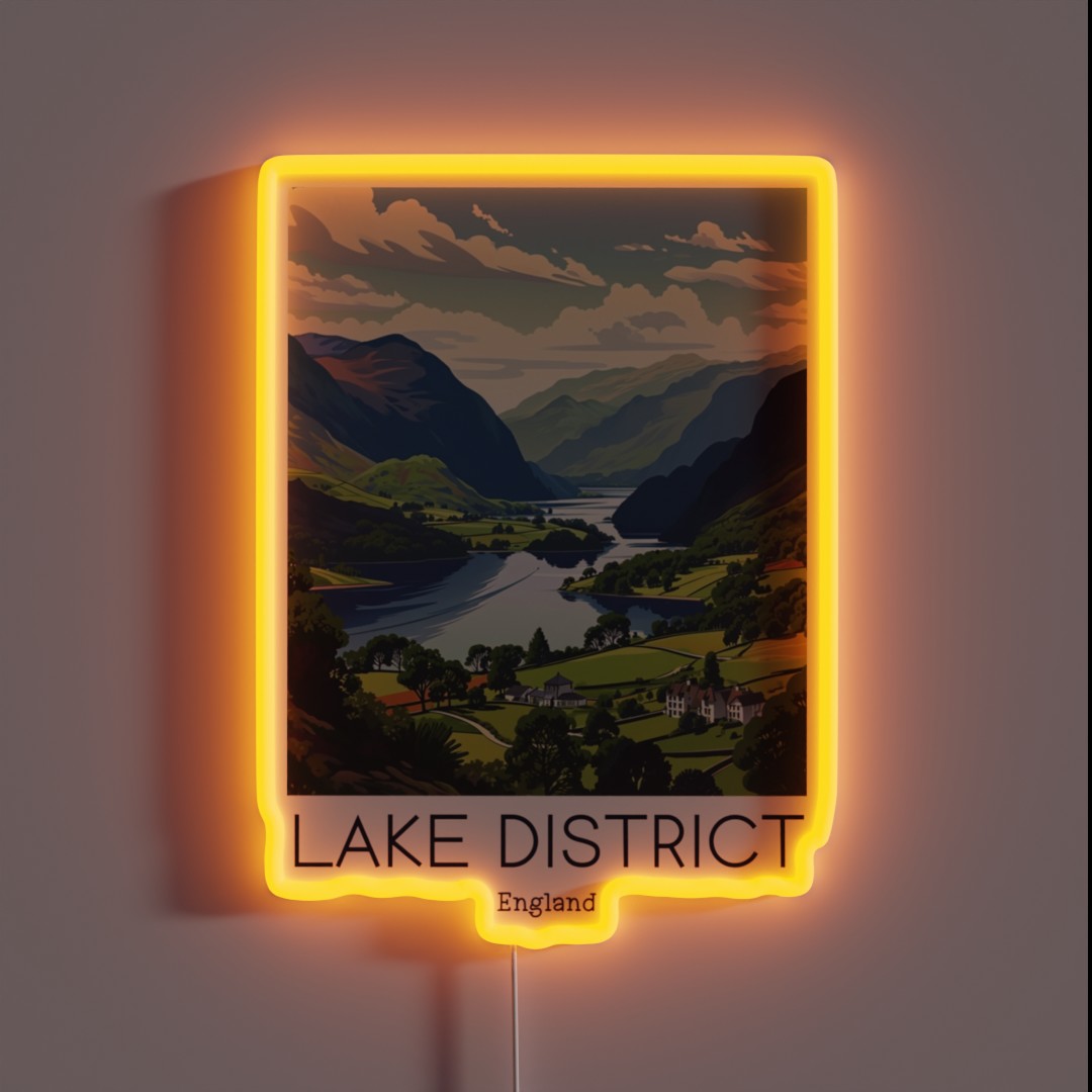 Add a touch of nostalgia to your space with this unique vintage travel illustration of the stunning Lake District in England, now available as an RGB neon sign featuring vibrant colors and a retro vibe.