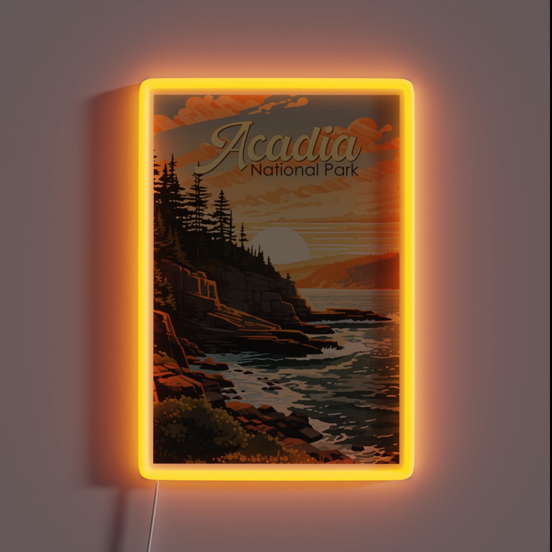 Add a touch of coastal charm to your home decor with this vintage-inspired Acadia National Park illustration retro RGB neon sign, featuring iconic Maine scenery in bold, colorful hues.