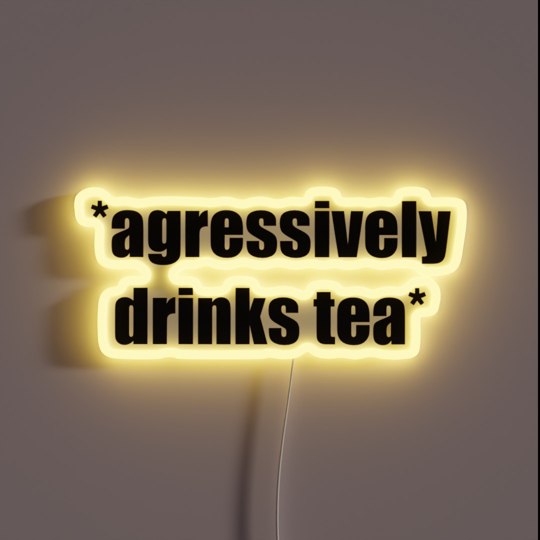 Add a vibrant and quirky touch to your home or office with this RGB neon sign that reads ‘Agressively Drinks Tea’, perfect for tea enthusiasts and gamers alike.
