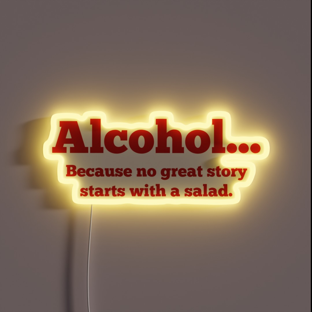 A customizable, 24″ wide RGB neon sign that reads “Alcohol Because No Great Story Starts With A Salad”. Perfect for bars, restaurants, and anyone who loves a good drink.