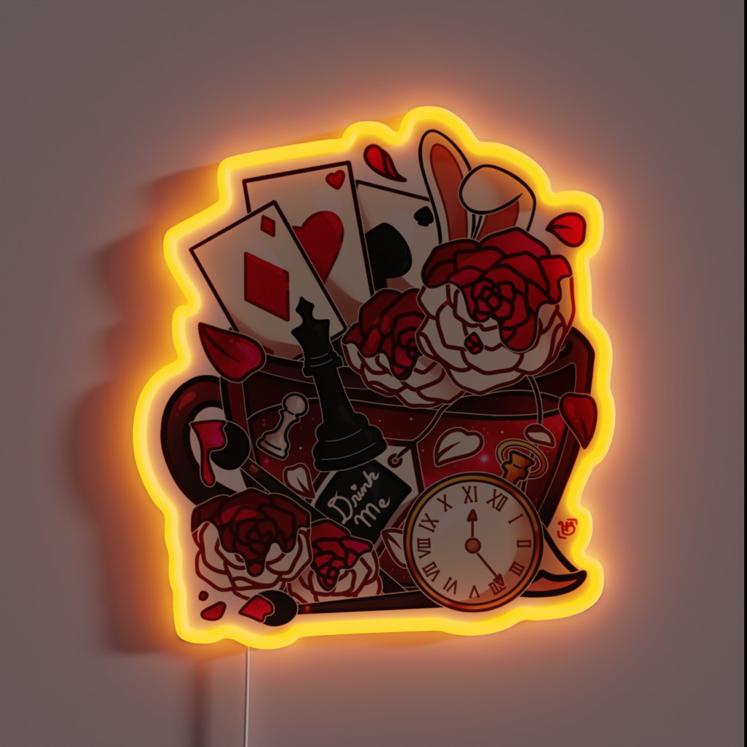 Add a touch of whimsy to any room with this vibrant Alice in Wonderland painted roses teacup RGB neon sign, featuring a mesmerizing glow that brings Lewis Carroll’s beloved tale to life.