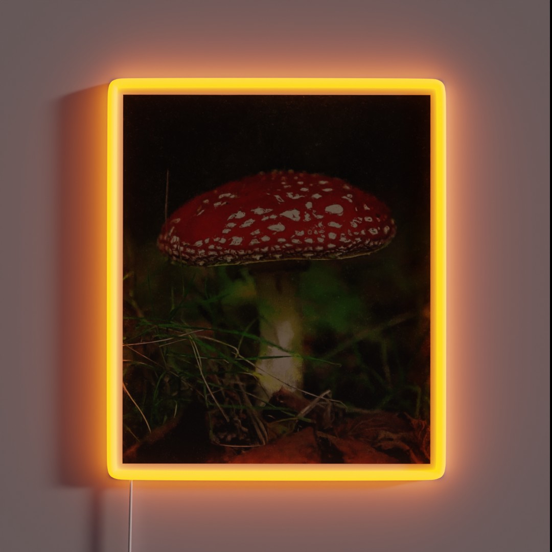 A vibrant, original RGB neon sign featuring an illustration of the iconic Amanita Muscaria mushroom, perfect for the mycology enthusiast or lover of psychedelic art.