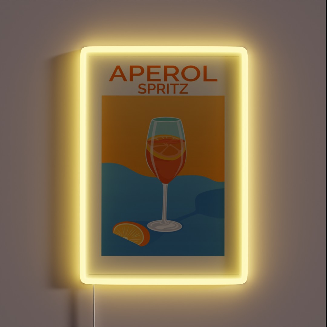 A vibrant RGB neon sign that illuminates the classic Italian cocktail, Aperol Spritz, perfect for bars and homes to add a touch of la dolce vita.