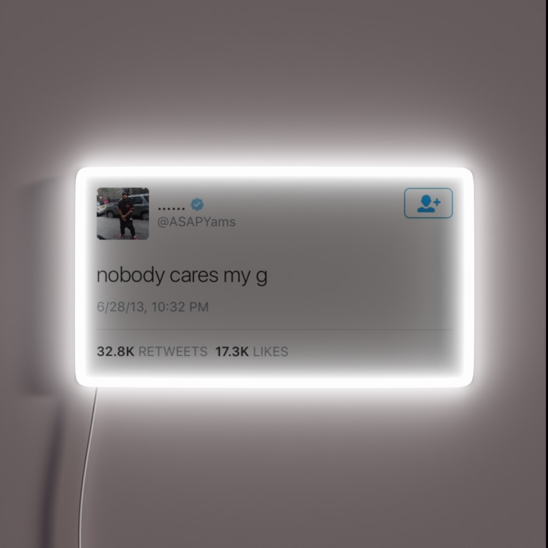 Perfect for fans of ASAP Ferg and his alter ego Yams, this sign is also an excellent choice for anyone who wants to add some fun and personality to their decor. Don’t settle for boring or bland โ make a statement with the ASAP Yams “Nobody Cares My G” RGB Neon Sign and show the world that you’re unapologetically yourself.