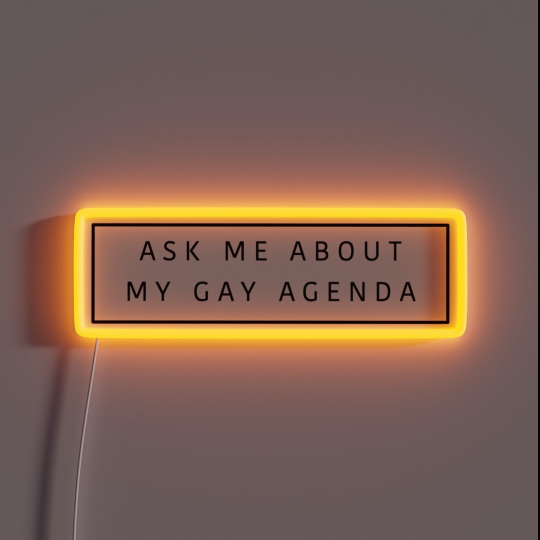 **LGBTQ+ Pride Statement – “Ask Me About My Gay Agenda” RGB Neon Sign** Make a bold statement with our “Ask Me About My Gay Agenda” RGB neon sign, celebrating individuality and pride in the LGBTQ+ community. This eye-catching, fully customizable sign is perfect for bedrooms, offices, or public spaces, shining bright with 16 million color options to match your unique style.