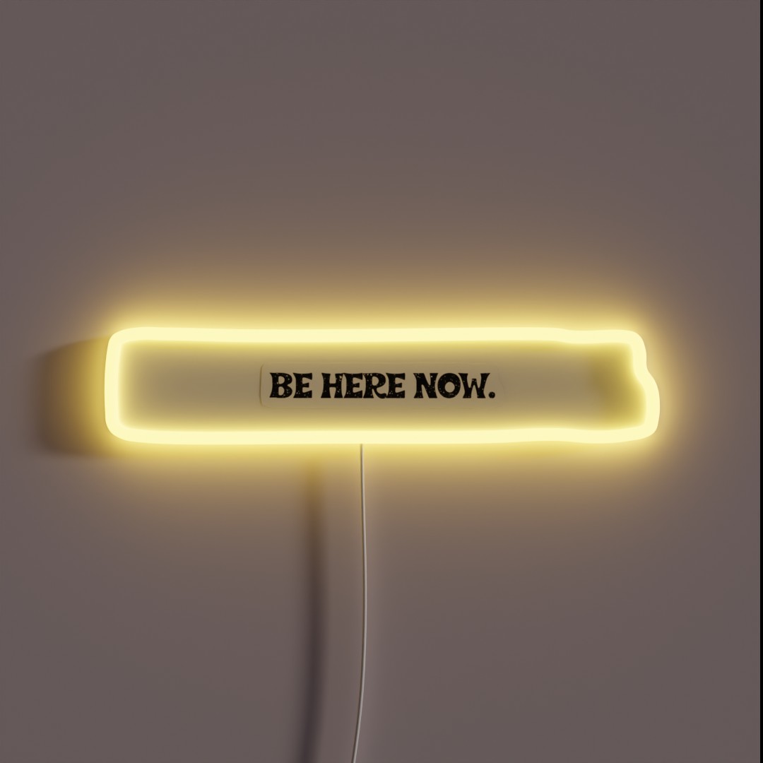 Bring a touch of serenity and visual interest to your space with this **Be Here Now** mantra RGB neon sign. Its thought-provoking message serves as a gentle reminder to stay present, while its advanced LED technology ensures it remains a durable and long-lasting addition to your decor.