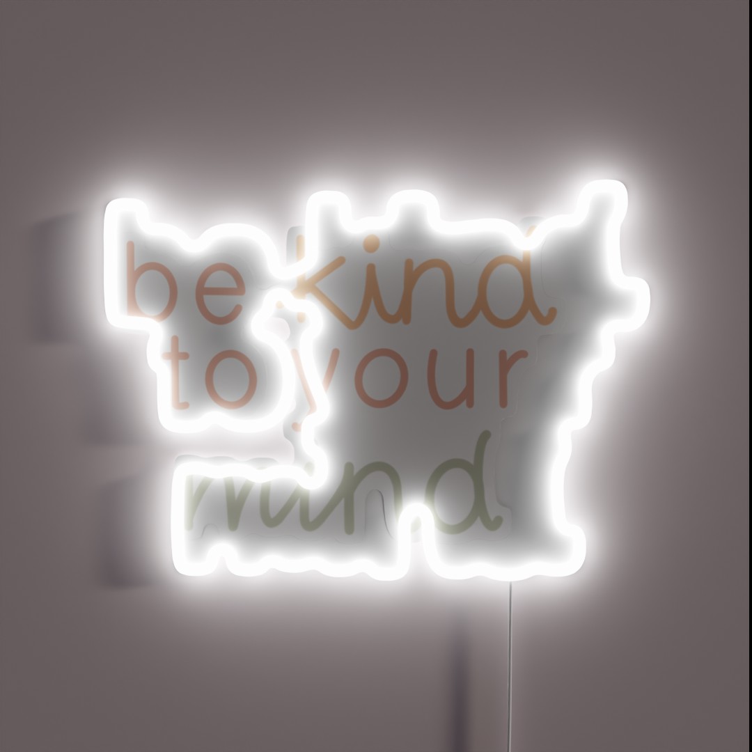 Promote mental wellness with the ‘Be Kind To Your Mind’ RGB neon sign, a vibrant and uplifting decorative piece encouraging self-care and positivity.