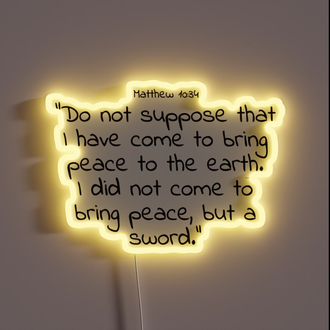Illuminated scripture: ‘Think not that I am come to send peace on earth; I came not to send peace but a sword’ – Matthew 10:34. Unique RGB LED neon sign with biblical quote for home or office decor.