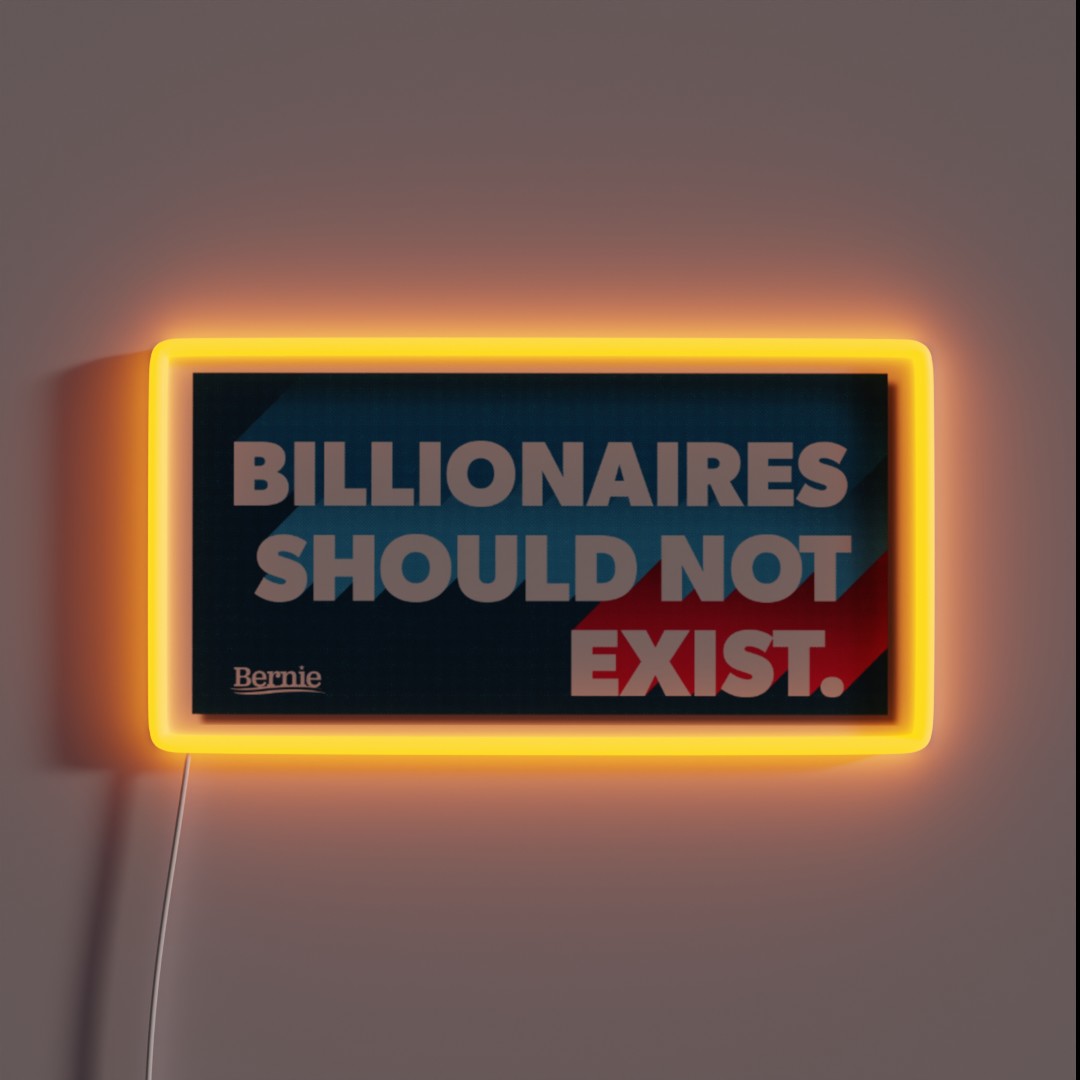 Electrify your space with this striking neon sign featuring Bernie Sanders’ iconic slogan ‘Billionaires Should Not Exist’. A vibrant and thought-provoking addition to any home or office, perfect for fans of the democratic socialist movement.