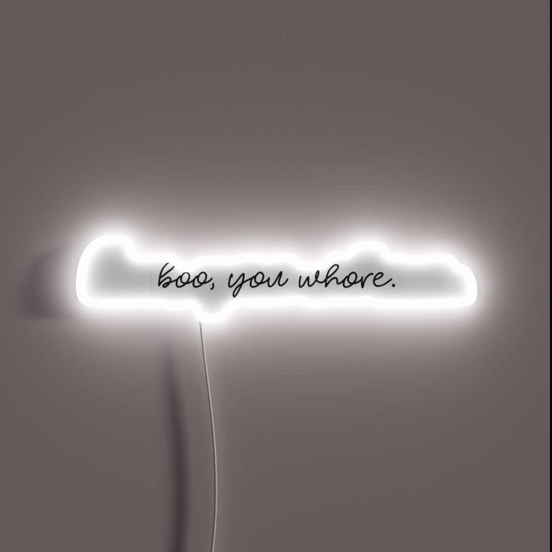 A sassy and eye-catching ‘Boo You Whore’ RGB neon sign that adds a touch of edgy humor to any room.