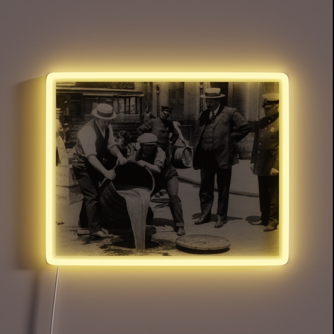 This unique sign features a vintage-style photo of a Prohibition-era liquor dump, complete with colorful illustrations and distressed design elements that give it a one-of-a-kind look. The RGB neon lights are touchable and safe to use, thanks to the low voltage (12V adapter included). This means you can enjoy the vibrant glow without worrying about electrical safety.
