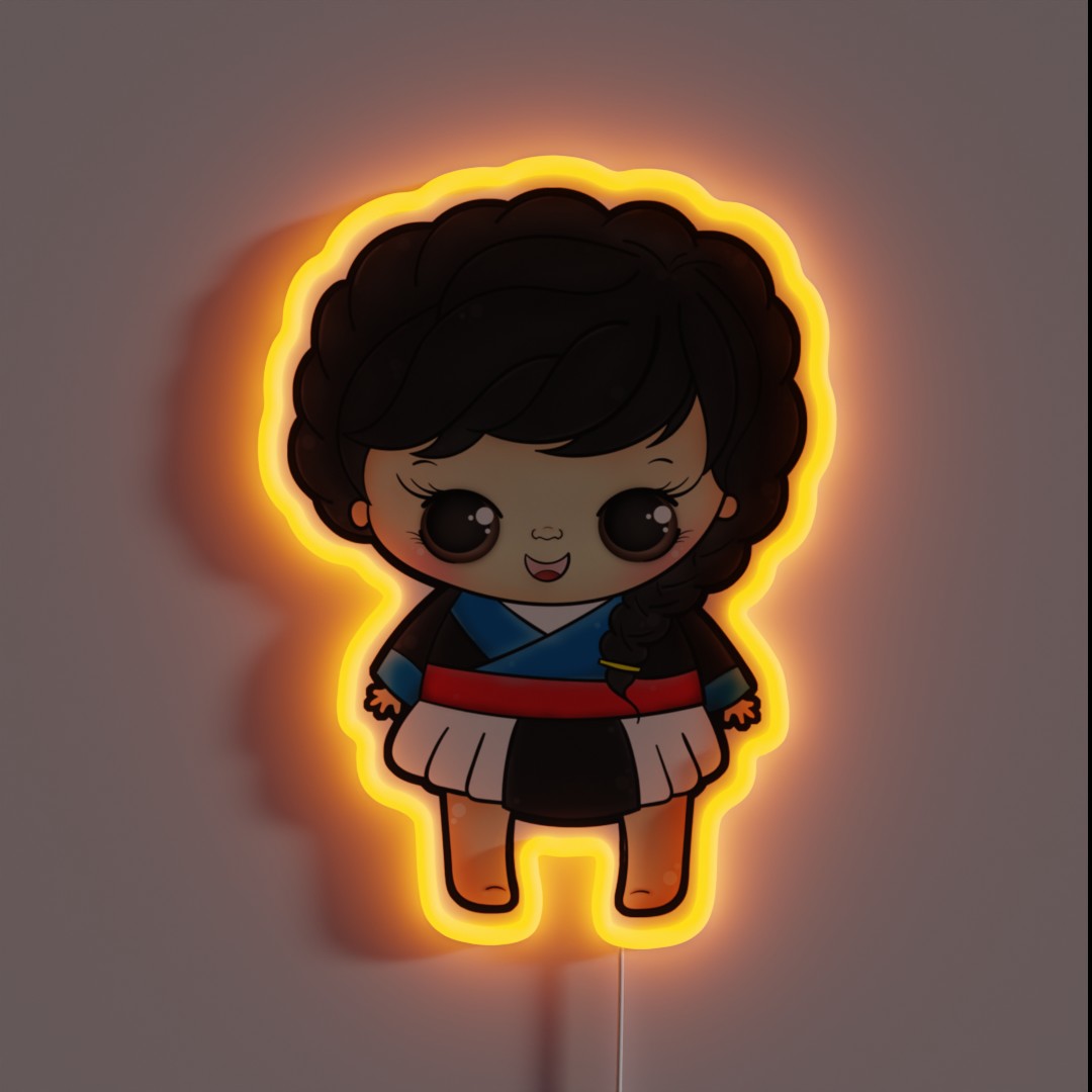 Unique neon sign featuring a vibrant, braided Hmong girl design in RGB colors, adding a pop of cultural charm to any room.