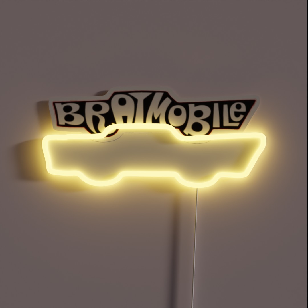 Retro-inspired neon sign featuring the iconic Bratmobile logo in bold, RGB colors, perfect for any Riot Grrrl fan or 90s nostalgia enthusiast.