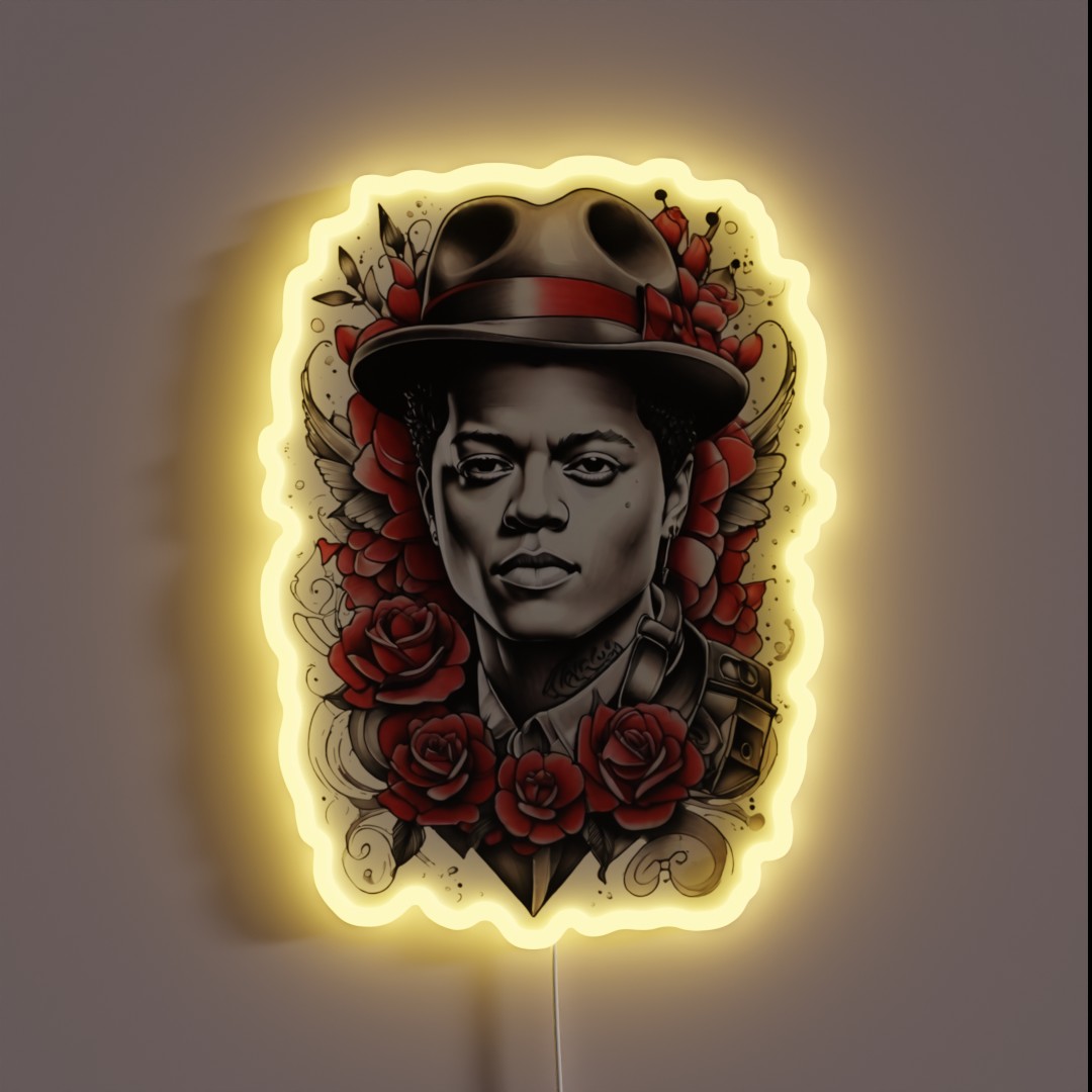 Add a touch of music-inspired glamour to your space with this one-of-a-kind Bruno Mars Inked Harmony RGB neon sign, blending pop culture flair and colorful lighting effects.