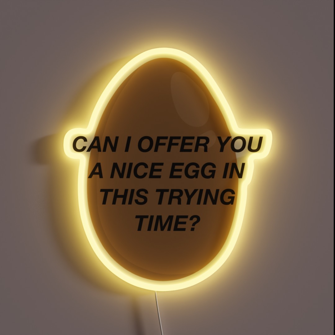 So why settle for boring decor when you can have a laugh-out-loud conversation starter? Get your “CAN I OFFER YOU A NICE EGG IN THIS TRYING TIME It’s Always Sunny” RGB neon sign today and add some much-needed humor to your life!