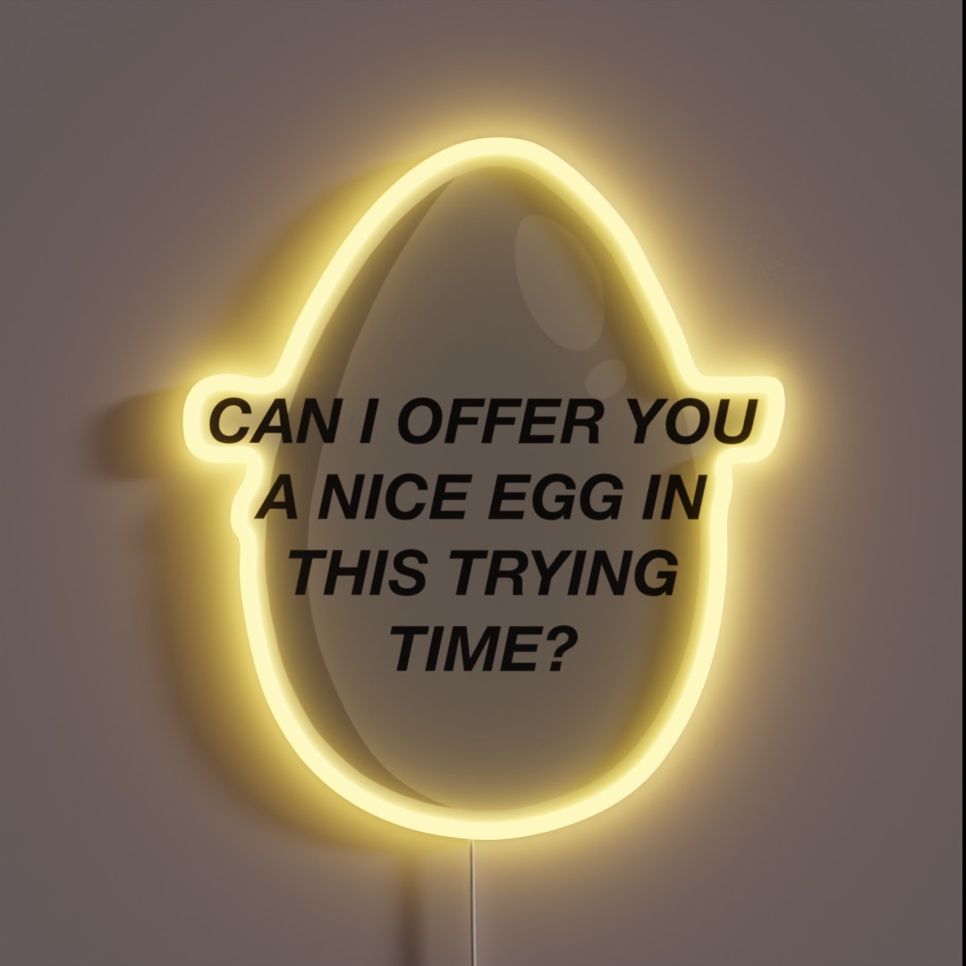 So why settle for a boring decoration when you can have a fun and quirky sign that says “CAN I OFFER YOU A NICE EGG IN THIS TRYING TIME”? Order yours today!