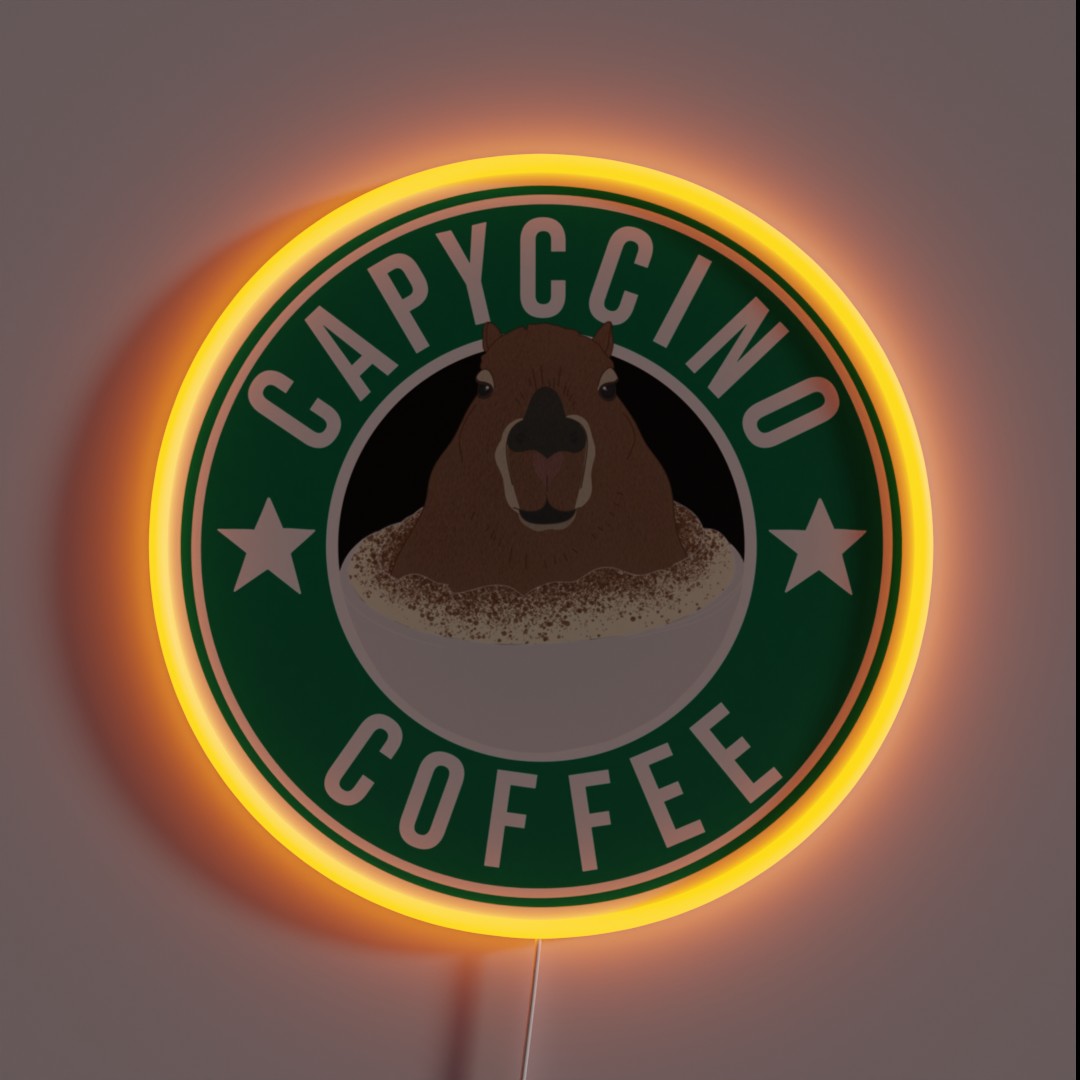 Experience the mesmerizing glow of the Capyccino Coffee RGB neon sign as it casts a vibrant ambiance in any space. Its compact design makes it easy to place on a wall, shelf, or even hang it above your coffee machine (a clever nod to its name!).