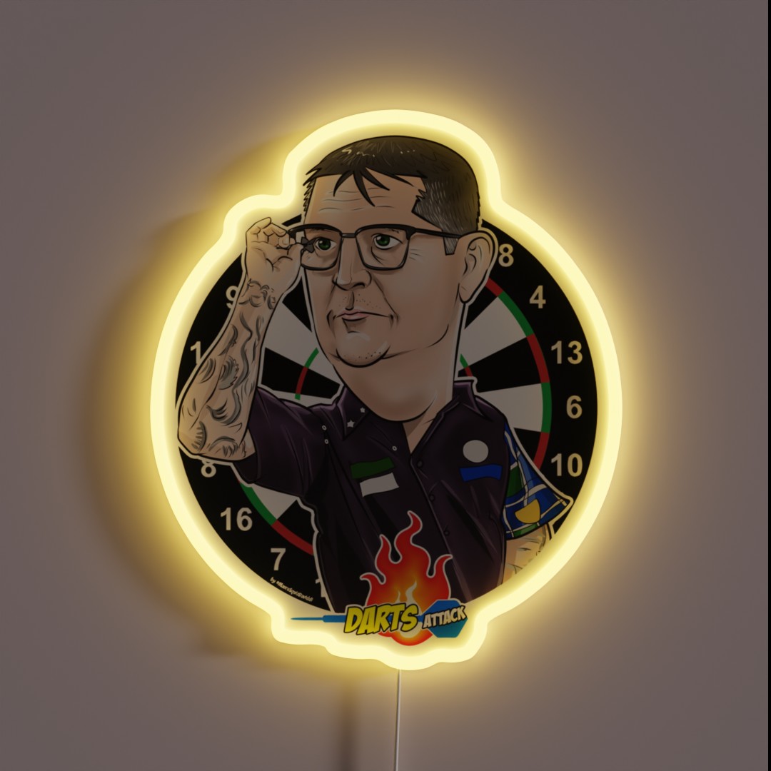 Add a touch of humor and color to your game room or office with this vibrant Caricatura Gary Anderson RGB neon sign, a unique tribute to the darts legend.