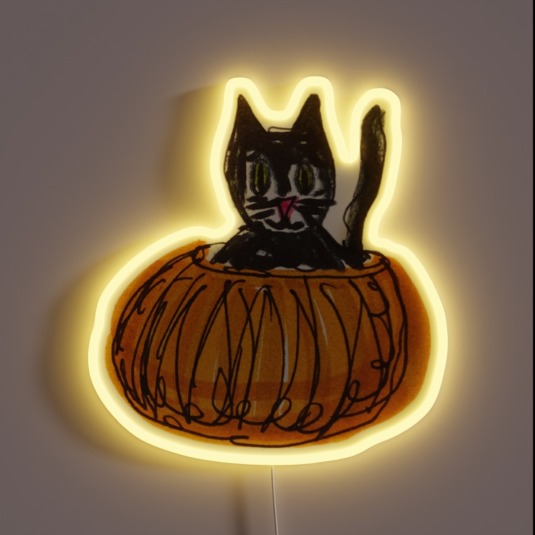 Elevate your home decor with this unique and eye-catching Cat in Pumpkin RGB neon sign. Handcrafted to bring a warm and playful touch to any room, this beautiful design features a adorable cat sitting inside a pumpkin, illuminated by vibrant RGB lights.