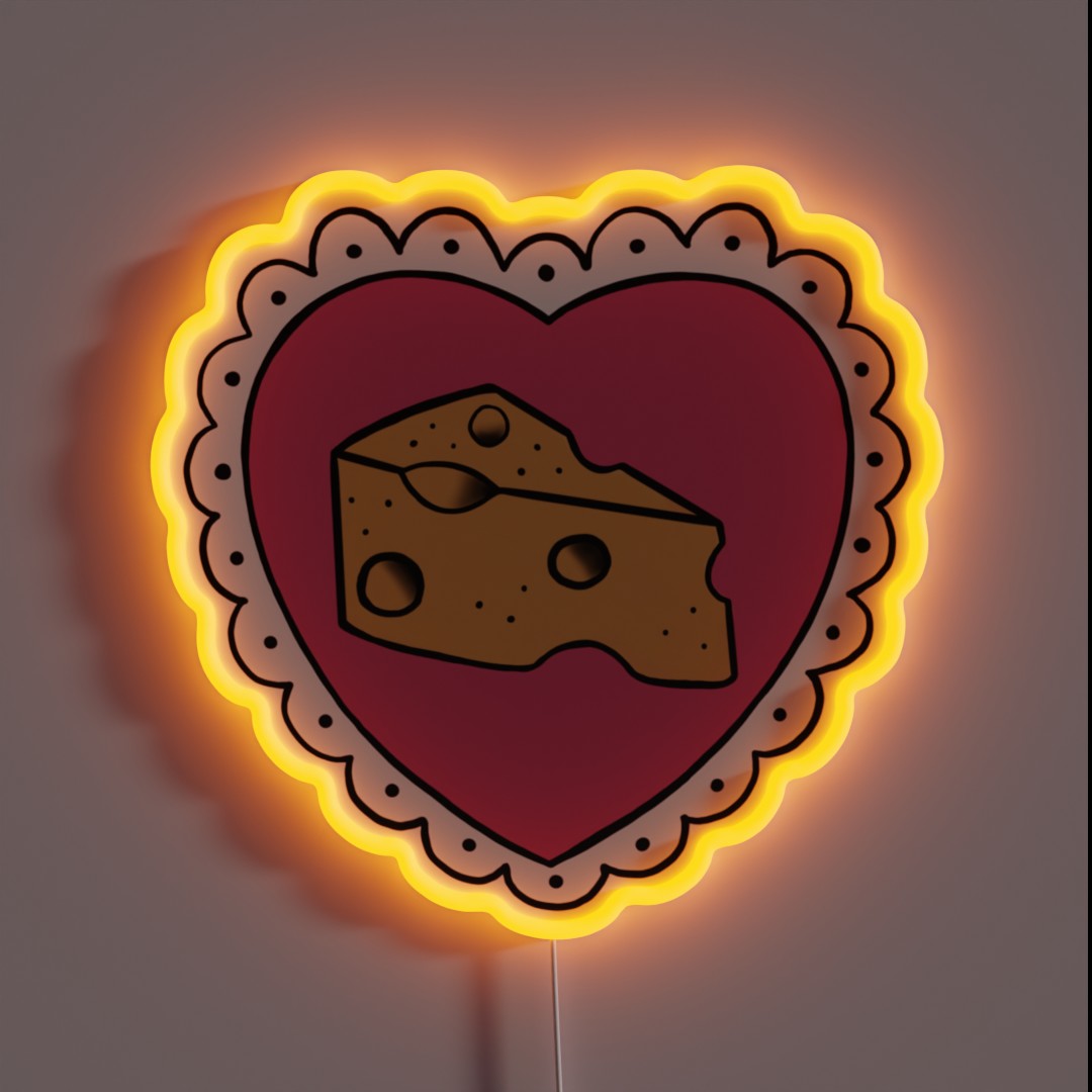 Perfect for foodies, cheeselovers, and anyone who wants to add some fun and personality to their space, this sign is a must-have decorative item. Order yours today and get ready to make a statement with your Cheese Heart Tattoo RGB Neon Sign!