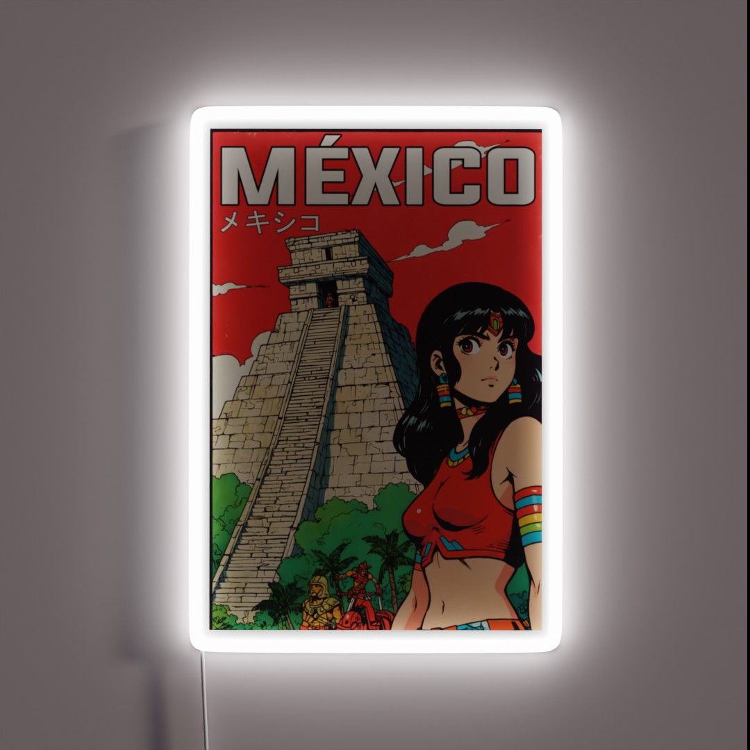 Add a touch of tropical flair to any room with this vibrant Chichen Itza Yucatan Mexico retro anime girl 80s vintage travel themed RGB neon sign, featuring nostalgic colors and a unique blend of cultures.