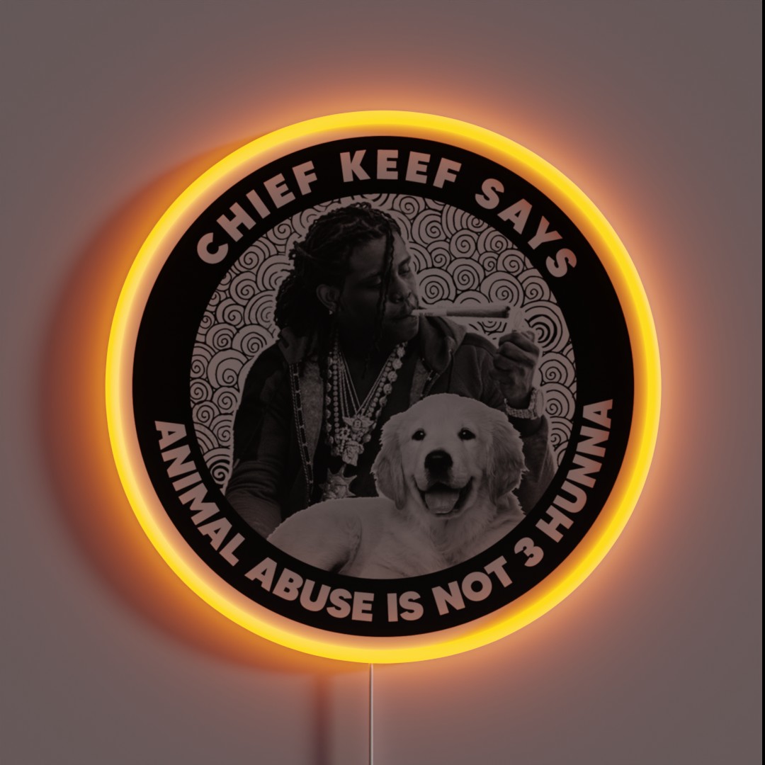 Don’t miss out on this opportunity to make a statement with your space. Order the Chief Keef Says Animal Abuse is Not 3 Hunna RGB neon sign today!