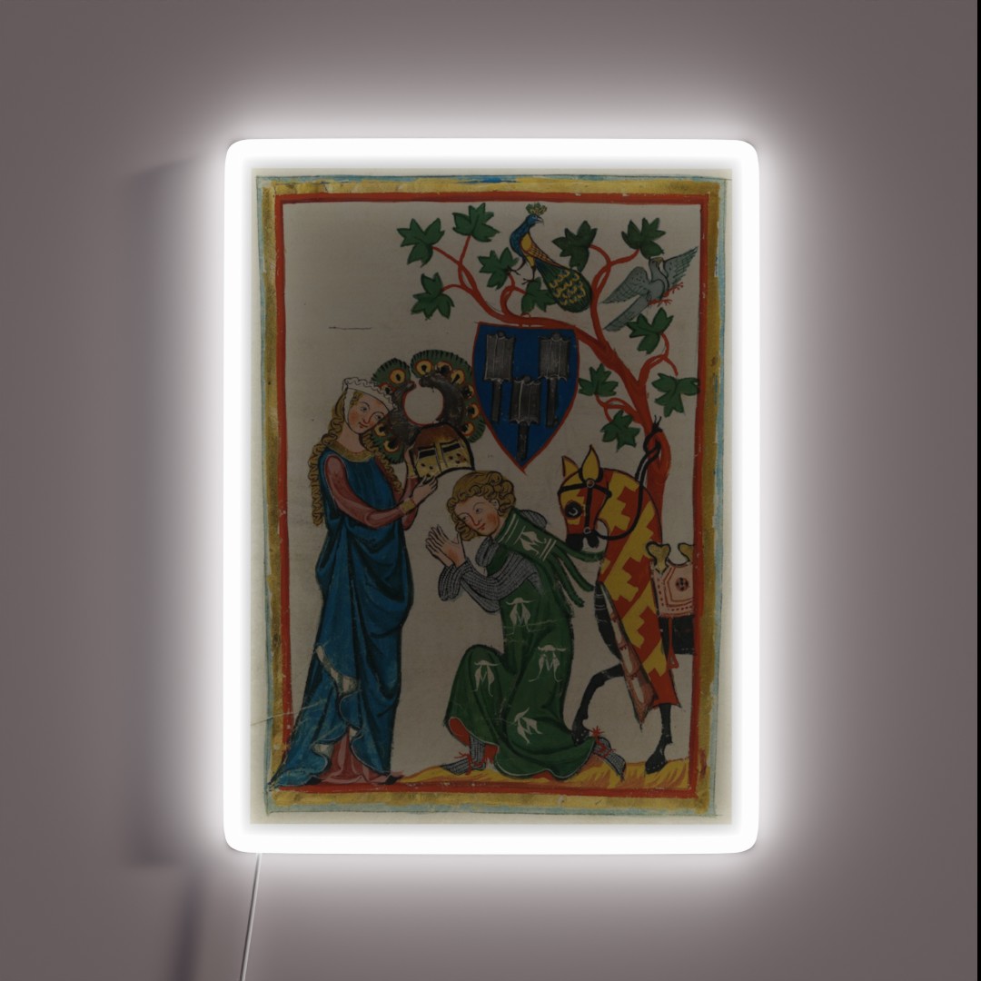 Inspired by the rich literary heritage of medieval Germany, this unique neon sign brings the artistry of the 14th century to your home or office. The Chivalry 14th Century Codex Manesse is a stunning representation of the illuminated manuscripts that once adorned the walls of castles and courts.