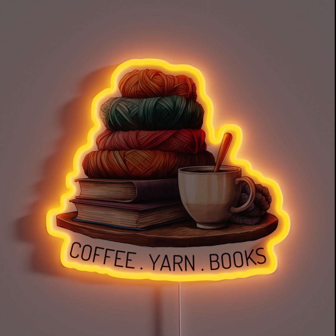Brighten up your space with this vibrant Coffee Yarn Books RGB neon sign, featuring colorful yarns and book-inspired design in radiant LED lights.