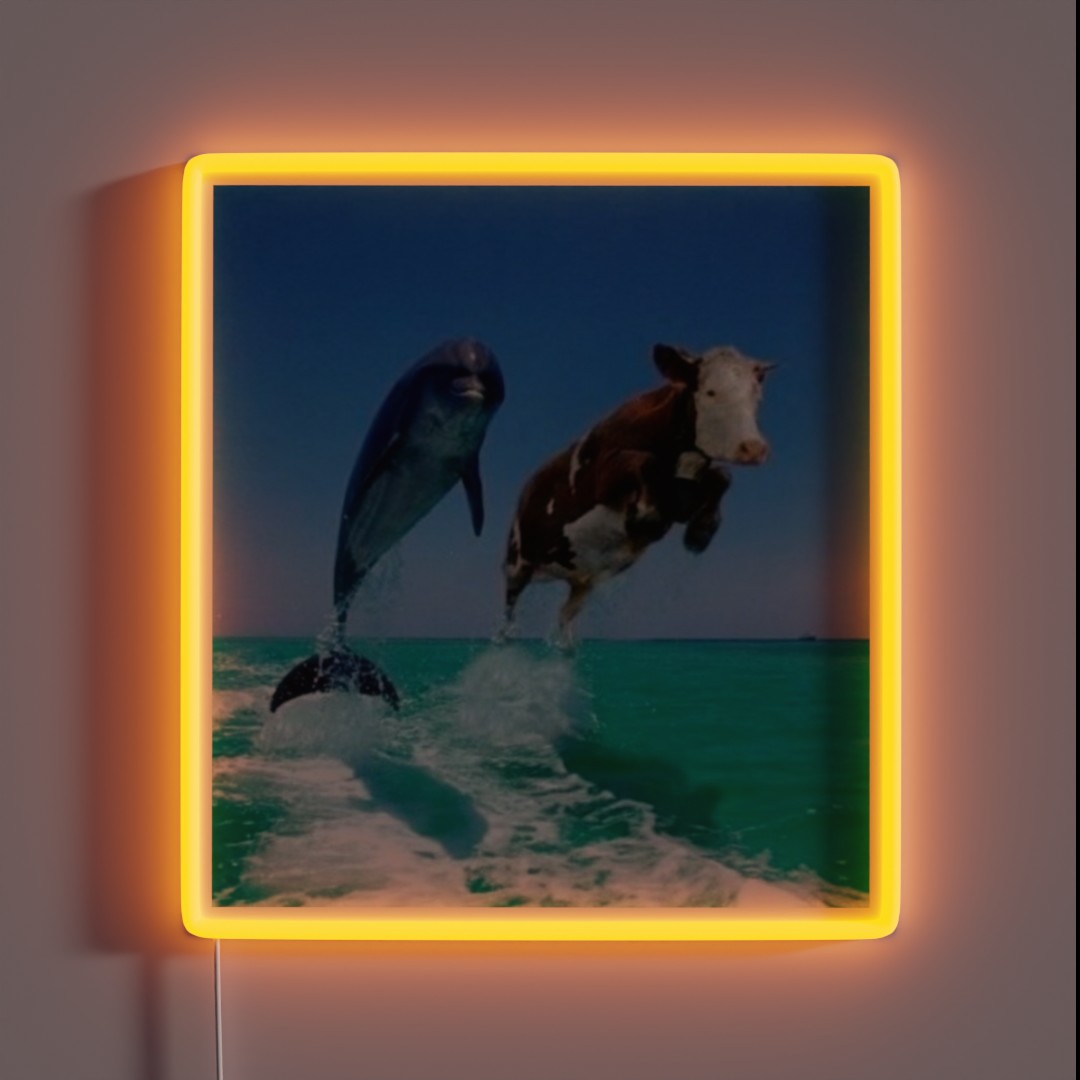 Add a playful touch to your home or office space with this vibrant and interactive decorative sign featuring a cow swimming with a dolphin in stunning RGB colors. Made from durable LED technology, this sign is designed to be long-lasting and non-fragile.