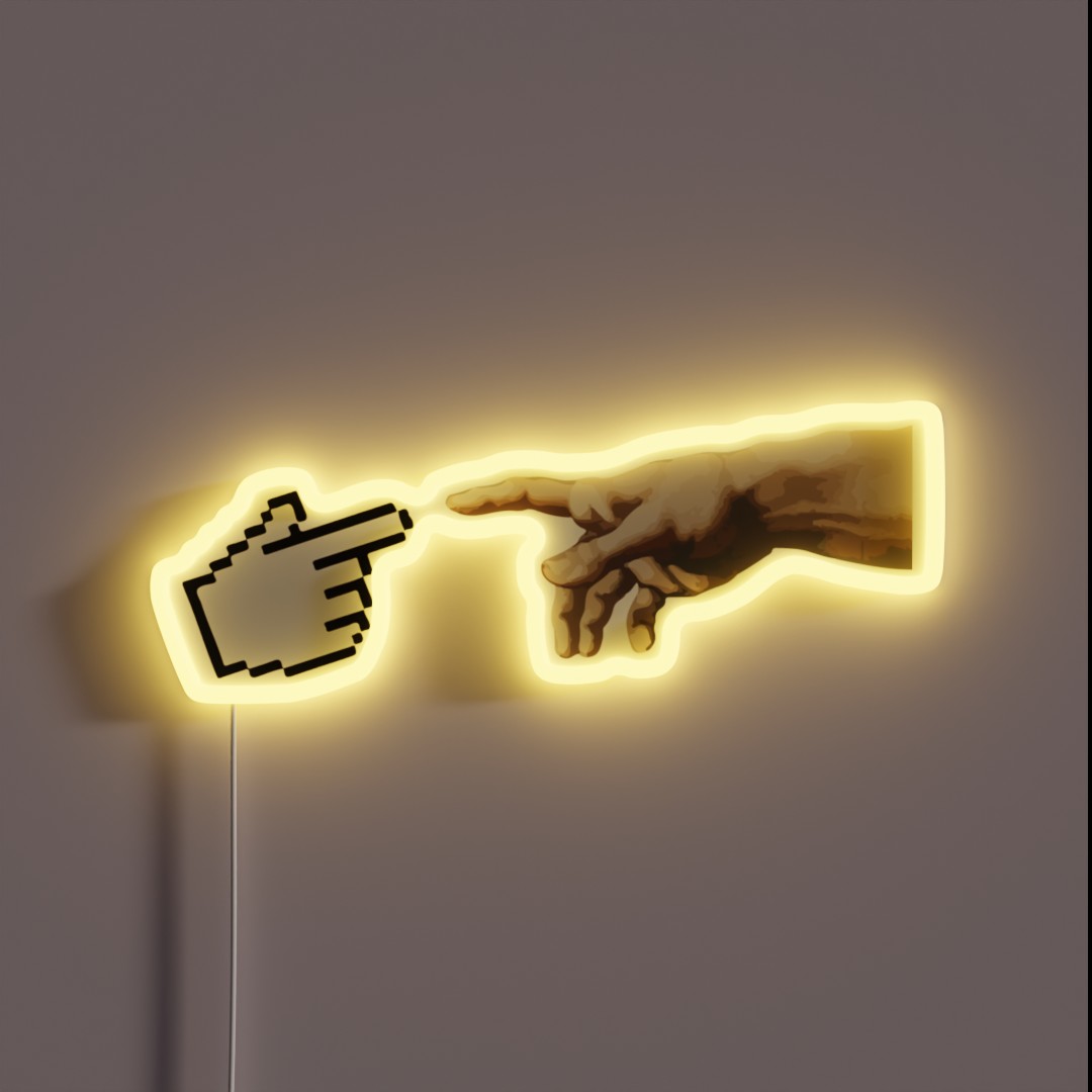Unique LED neon art reproduction of Michelangelo’s iconic ‘Creation of Adam’ scene from the Sistine Chapel ceiling, capturing the essence of divine creation in vibrant RGB colors.