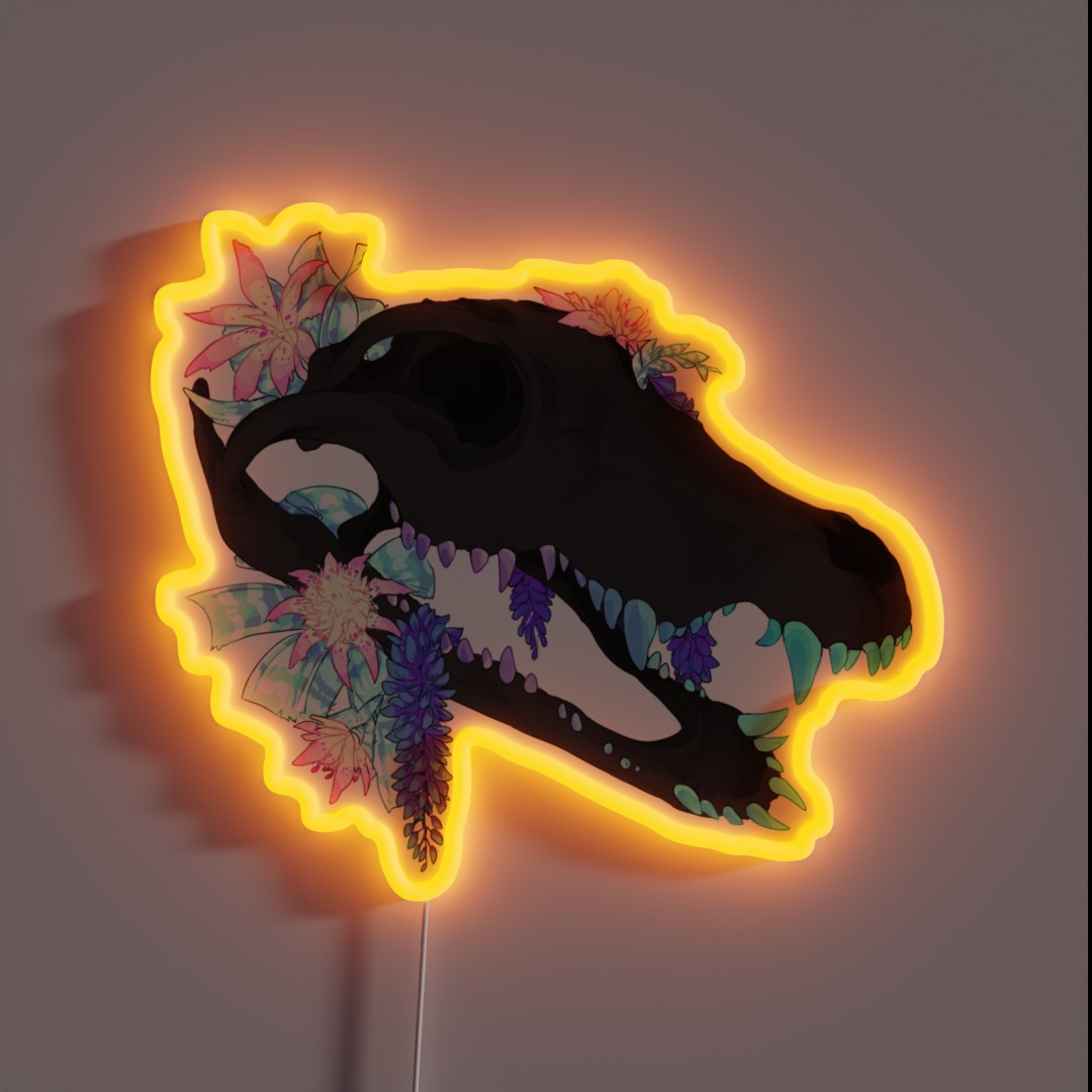 Unique Neon Sign featuring a Crocodile Skull amidst vibrant RGB Flower Petals, adding a touch of edgy elegance to any space.