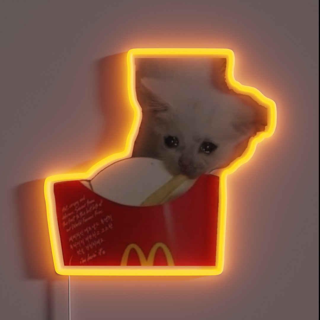 Add a touch of internet humor to your home decor with this vibrant RGB neon sign featuring a distressed Crying Cat enjoying a French Fry, perfect for fans of the Twitter-famous meme.