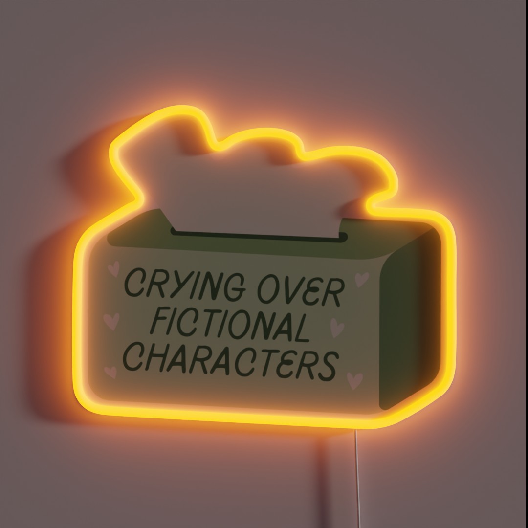 Add a pop of color to your space with this RGB neon sign featuring a playful design that pokes fun at the all-too-relatable struggle of crying over fictional character plot twists.