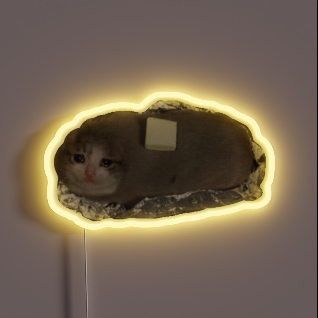 Add a touch of internet humor to your home decor with this vibrant Crying Potato Cat with Butter meme-inspired RGB neon sign, bringing a playful nod to the beloved online phenomenon.