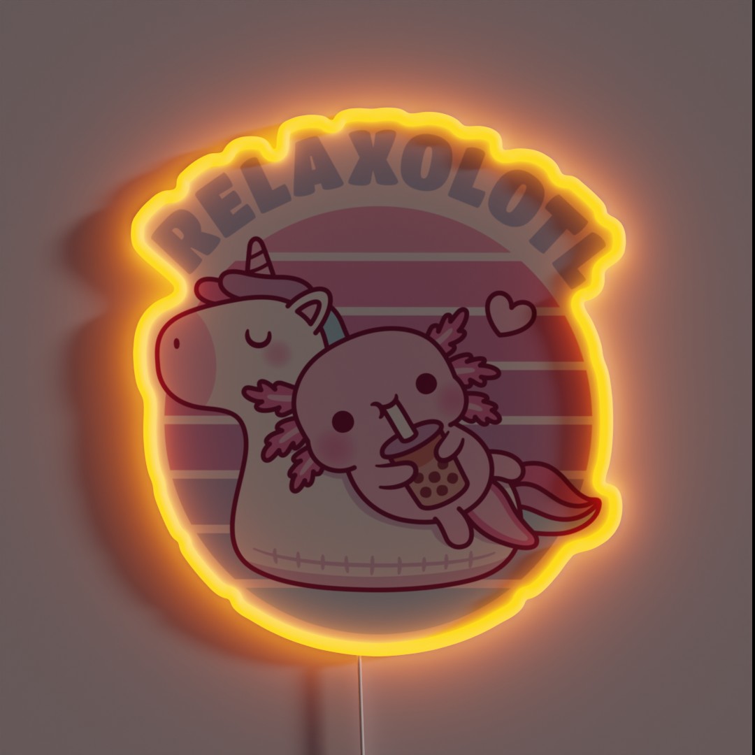 Add a touch of magic to your home decor with this unique and colorful Relaxolotl RGB Neon Sign featuring a cute axolotl chilling on a unicorn pool float, perfect for fans of whimsical and fun designs.