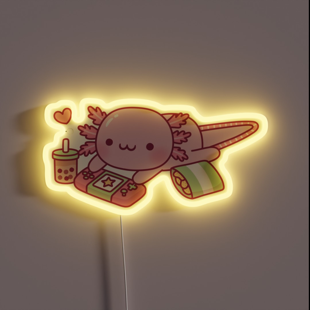 Glowing neon sign featuring an adorable axolotl design, perfect for gamers who love to relax in their own unique gaming space.