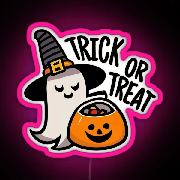 Add a spooky-chic touch to your Halloween decor with this vibrant RGB neon sign featuring a cute ghost holding a pumpkin candy bucket, perfect for trick-or-treaters and party hosts alike.