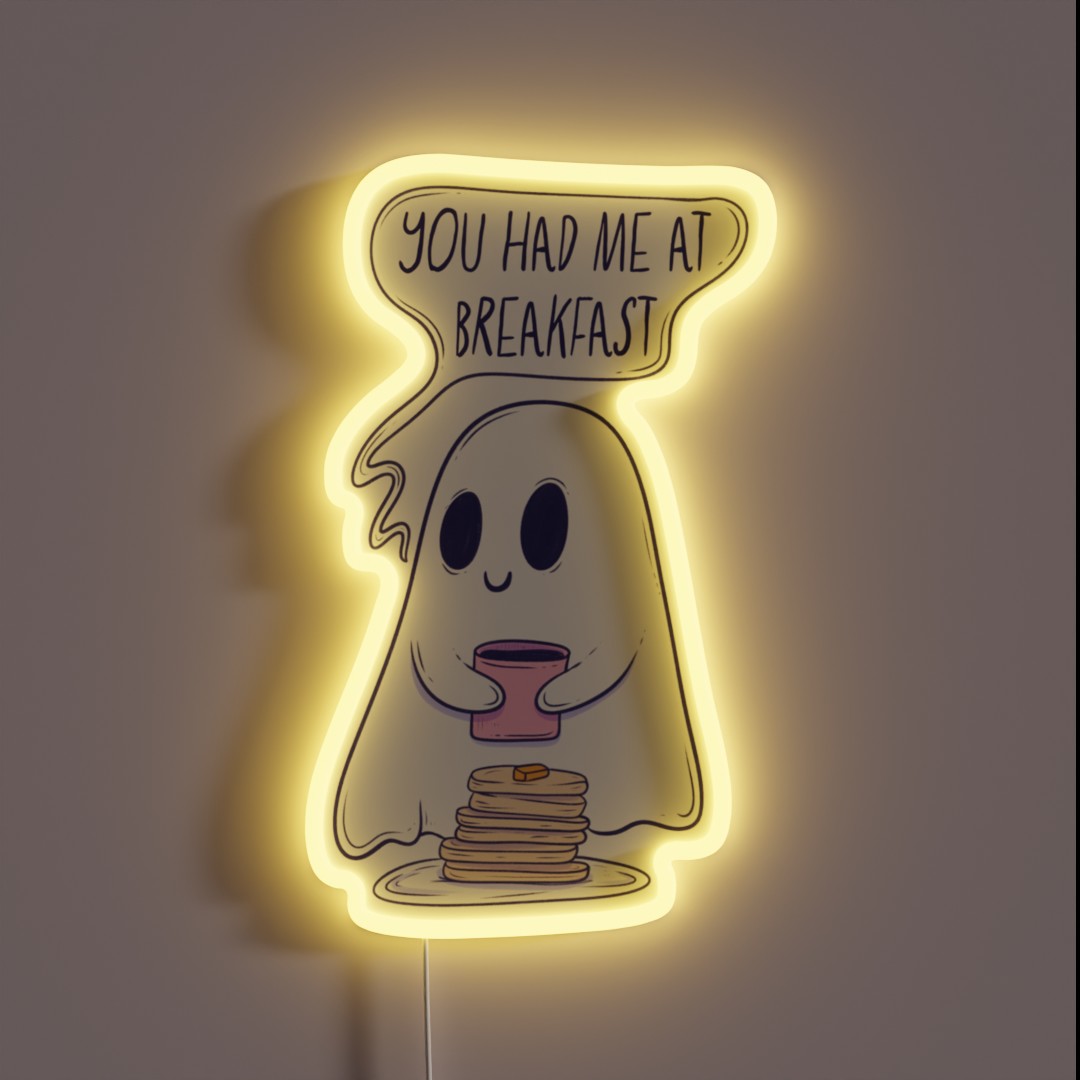 Neon breakfast spirit decorative sign featuring a cute ghost begging for fluffy treats in vibrant RGB colors.