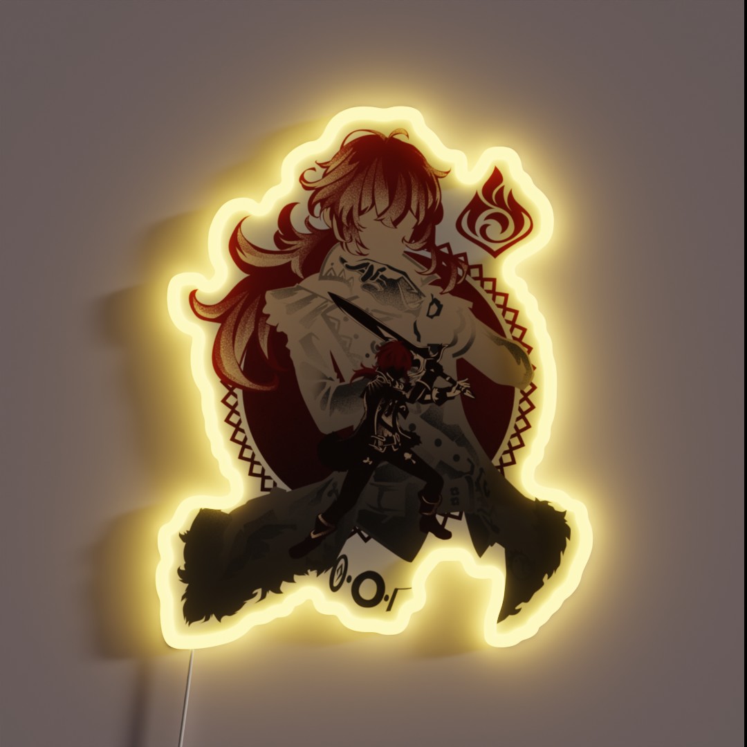 Elevate your space with the Dark Side of Dawn Diluc RGB neon sign, inspired by the popular Genshin Impact character. This vibrant, handcrafted neon art piece adds a touch of fantasy to any room.