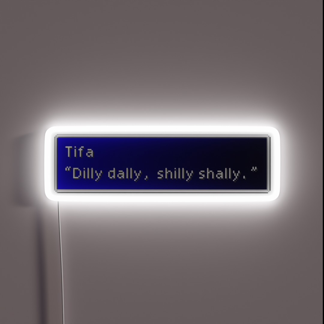 Add a touch of Final Fantasy flair to your space with this vibrant Dilly Dally Shilly Shally Tifa Lockhart Dialogue Box RGB neon sign, perfect for fans and gamers alike.