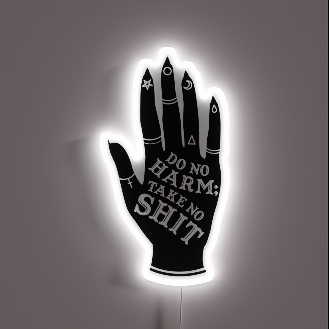 Introducing the “Do No Harm Take No Shit” Hand RGB Neon Sign, a bold statement piece for those who refuse to back down. This eye-catching sign is not just a decorative item but a reflection of your unyielding spirit.