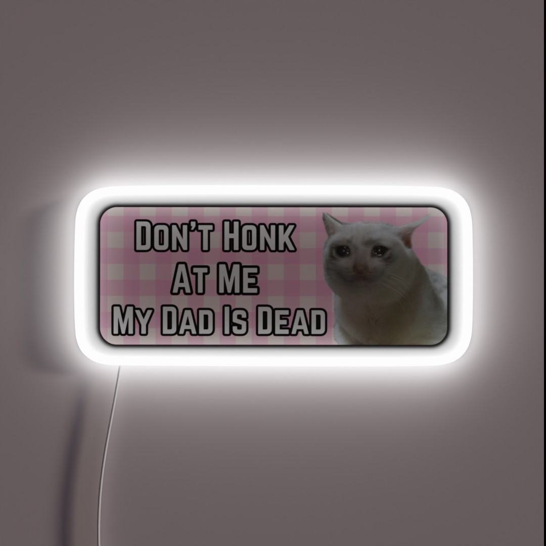 Add a dash of dark humor to your vehicle with our ‘Don’t Honk At Me My Dad Is Dead’ pink cat crying RGB neon sign, a quirky bumper led that’s sure to turn heads on the road.