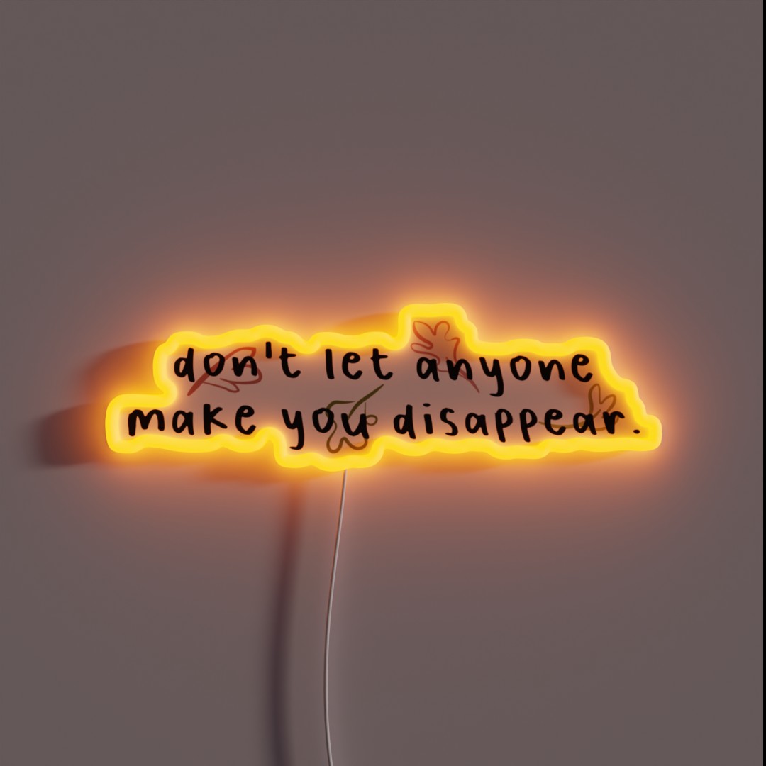 Whether you’re looking to add a touch of personality to your home, office, or dorm room, or simply want to spread a positive message, this “Don’t Let Anyone Make You Disappear” neon sign is the perfect choice. Its bold design and vibrant colors will surely catch attention and spark meaningful conversations.