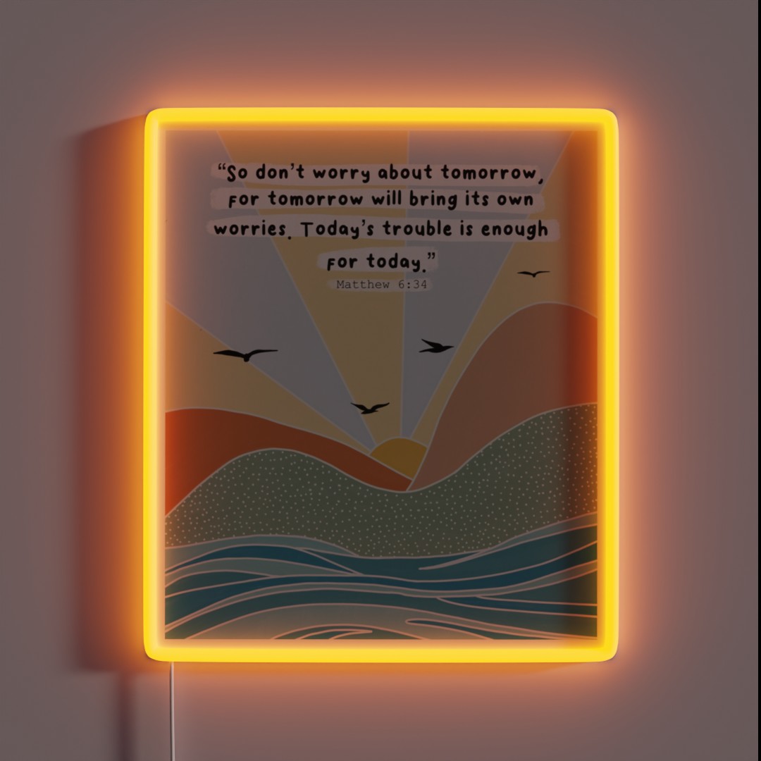 This quote sign makes for an excellent addition to any room, serving as a conversation starter and a reminder to stay grounded in the present. Perfect for those looking to add a touch of inspirational design to their space, this Matthew 6:34 RGB neon sign is sure to bring positivity and motivation into your life.
